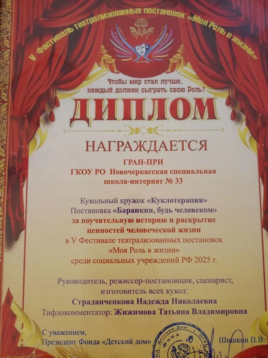 Кукольный театр «Куклотерапия» с постановкой спектакля «Баранкин, будь человеком!» завоевал высшую награду Гран-при. Детский коллектив кукольного театра, принимал не только участие в спектакле, но и готовил видеоинтервью. Ребята делились своей работой, интересными и запоминающимися моментами, рассказывали свои истории из жизни кукольного театра. В копилке театра уже есть победы на региональном и Всероссийском уровне - 1 место за спектакль «Щелкунчик».